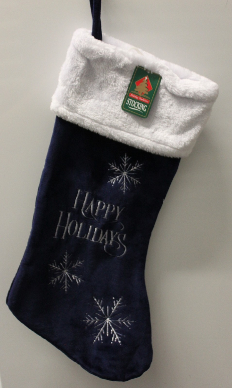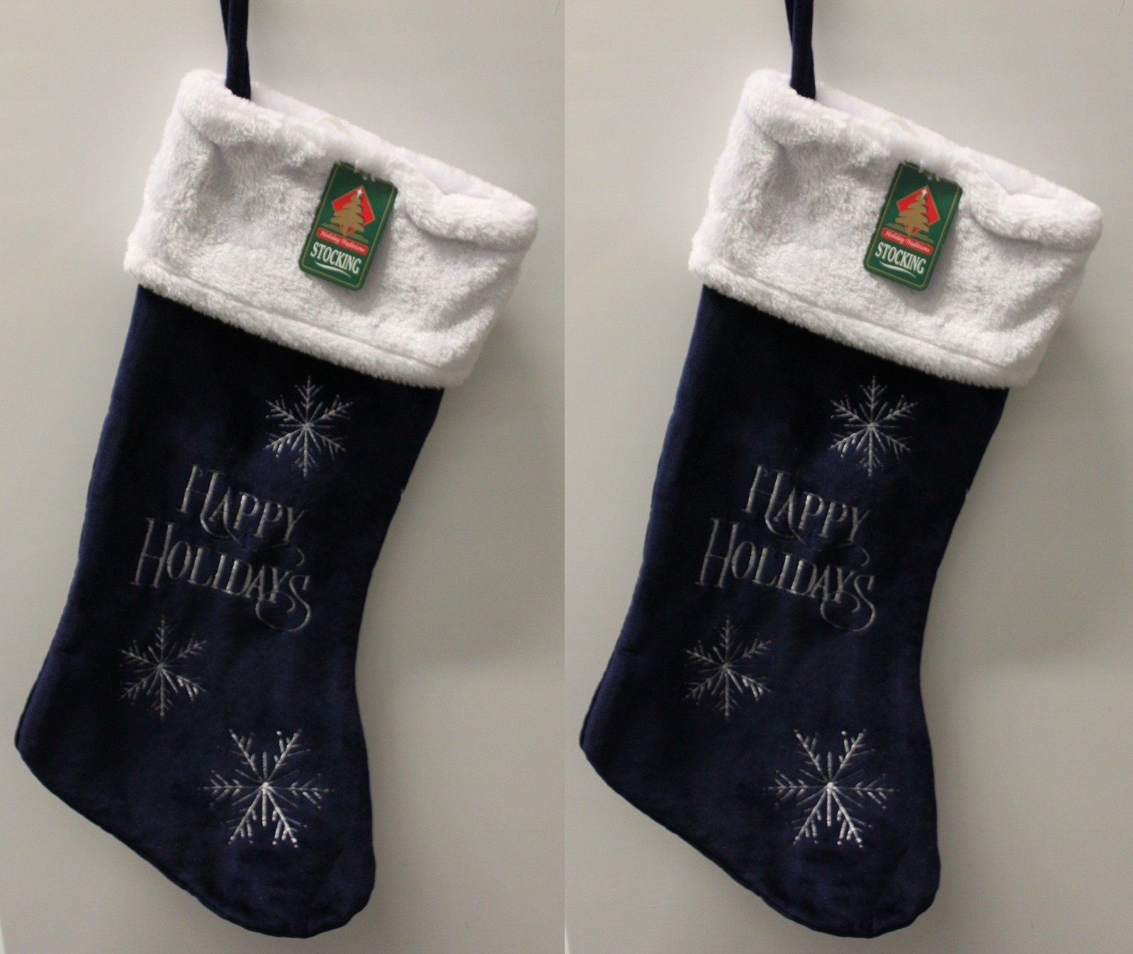 Celebrate the holidays with this matching pair of Happy Holidays Christmas stockings by Holiday Traditions! Each stocking says “Happy Holidays” in silver and has silver snowflakes on the front. The stockings have plush white cuffs and a loop for hanging by the chimney with care.