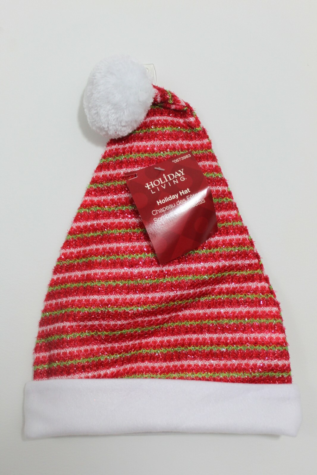 Celebrate the holidays with this pair of matching Santa hats. The hats are sparkling red with white and green stripes; a large, white brim; and white pompom.Santa hat is sized for most adults but will not fit especially large heads.
