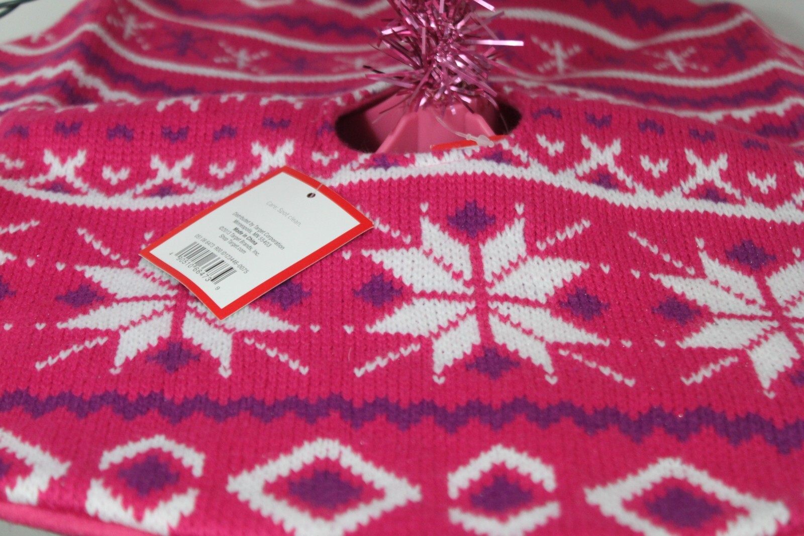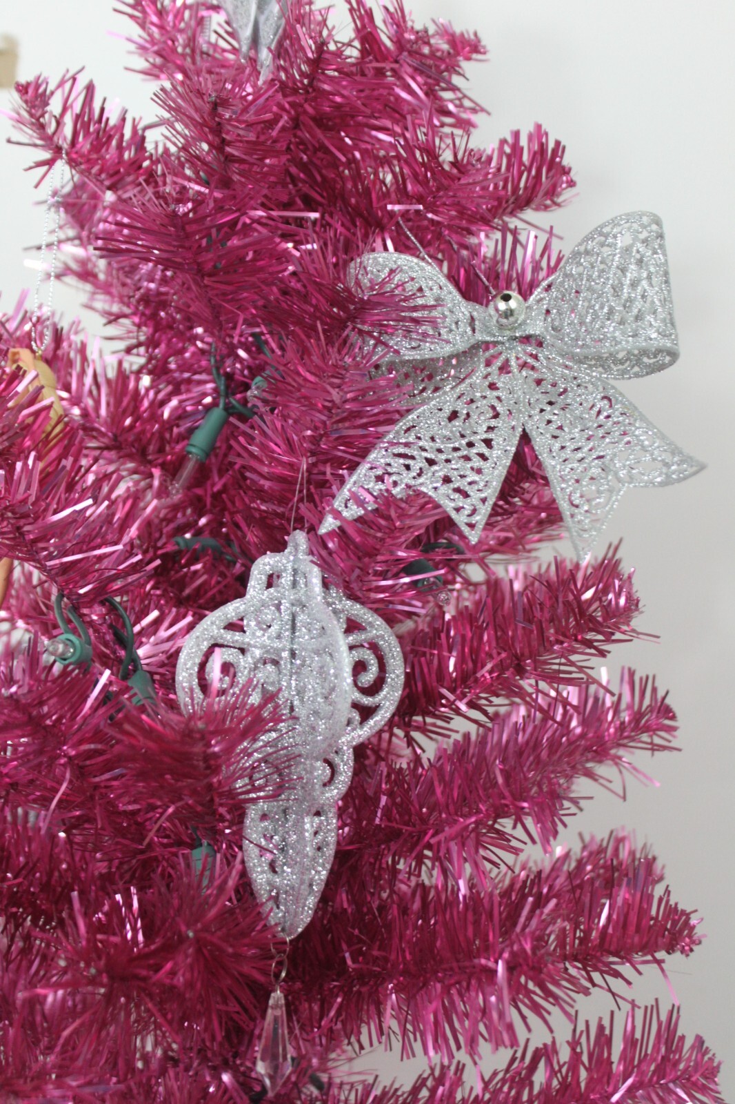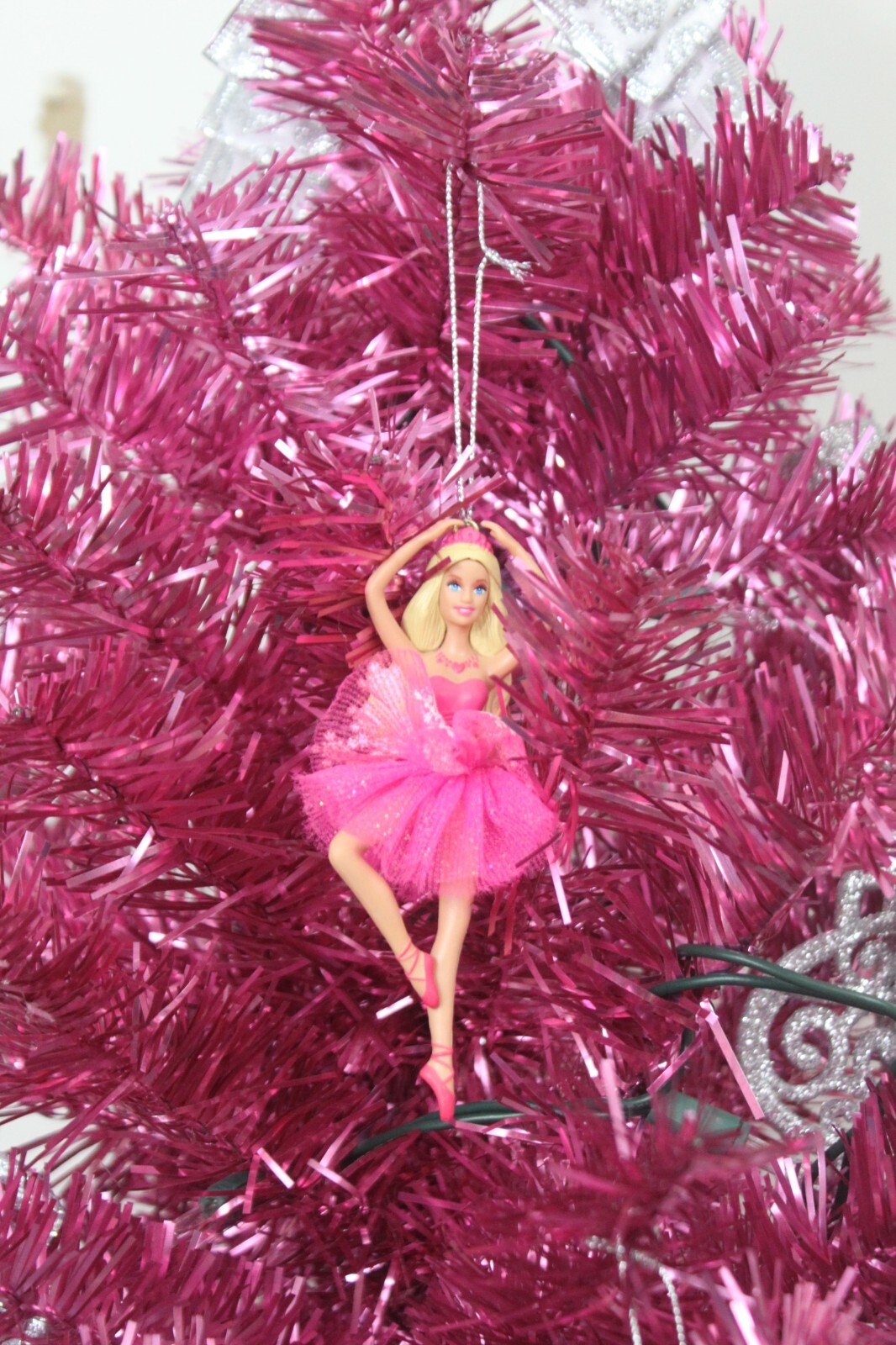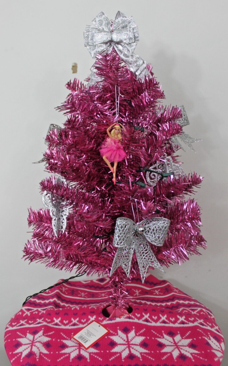 Barbie as the Sugar Plum Princess in this Christmas tree sure to delight!The dazzling pink tinsel tree measures 2 feet tall and has attached stand. The tree is decorated with three silver bows and two silver dangling ornaments with clear prism crystal at the bottom. A silver bow tops the tree. A pink knit and lined tree skirt from Target is at the base. The tree is lit with white mini lights.The highlight of the tree is an authentic American Greetings licensed Barbie Sugarplum Princess ornament. Barbie is wears a pink dress with pink net tutu adorned with white snowflakes.