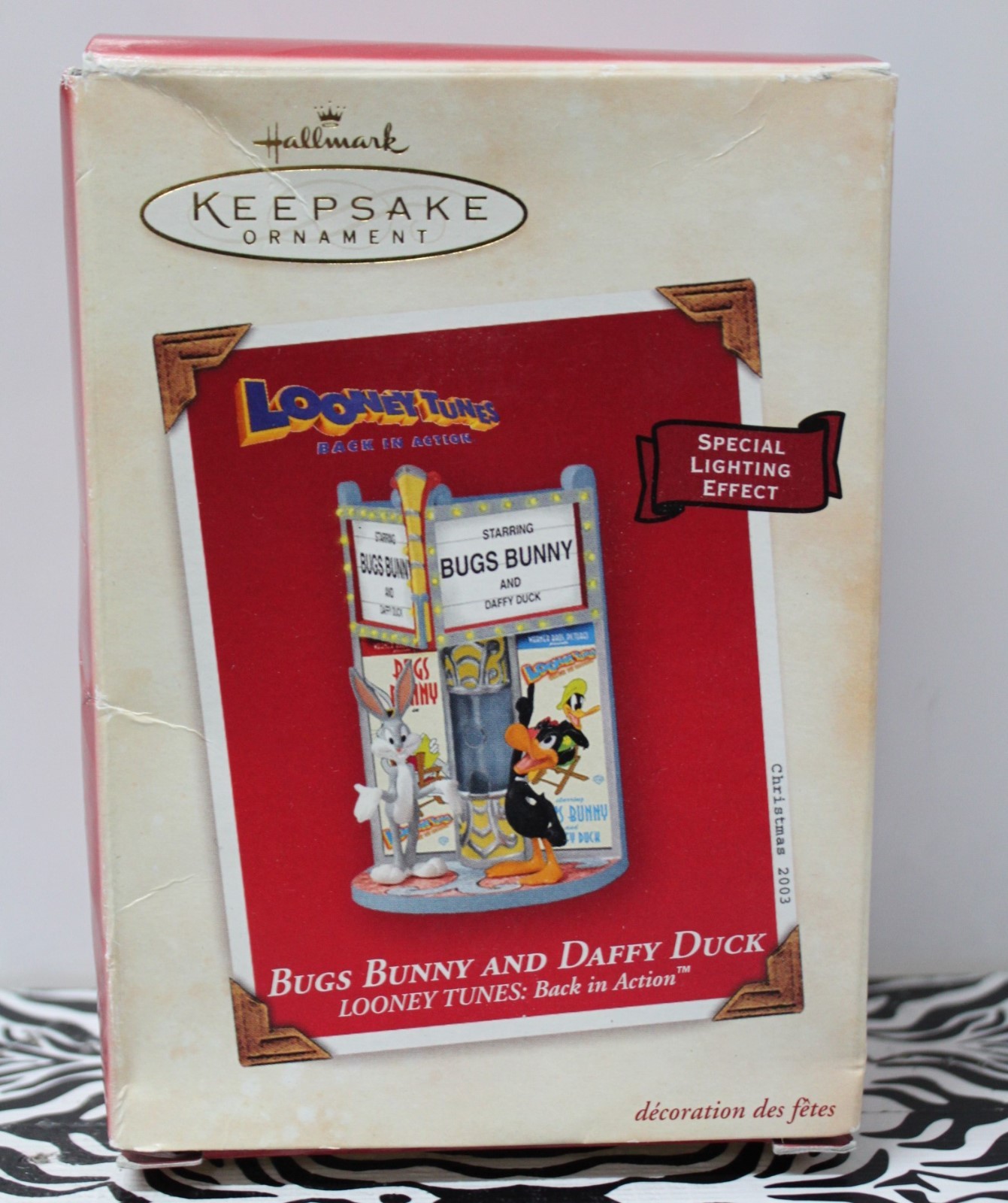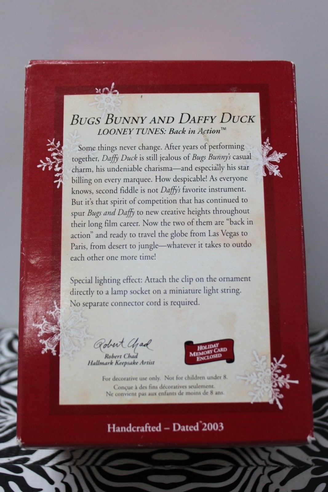 Some things never change. After years of performing together, Daffy Duck is still jealous of Bugs Bunny’s casual charm, his undeniable charisma – and especially his star billing on every marquee. How despicable! As everyone knows, second fiddle is not Daffy’s favorite instrument. But it’s that spirit of competition that has continued to spur Bugs and Daffy to new creative heights throughout their long film career. Now the two of them are “back in action” and ready to ravel the globe from Las Vegas to Paris, from desert to jungle – whatever it takes to outdo each other one more time!Special lighting effect: Attach the clip on the ornament directly to a lamp socket on a miniature light string. No separate connector cord is required.Box measures approximately 3.75″x5.25″x2.5″