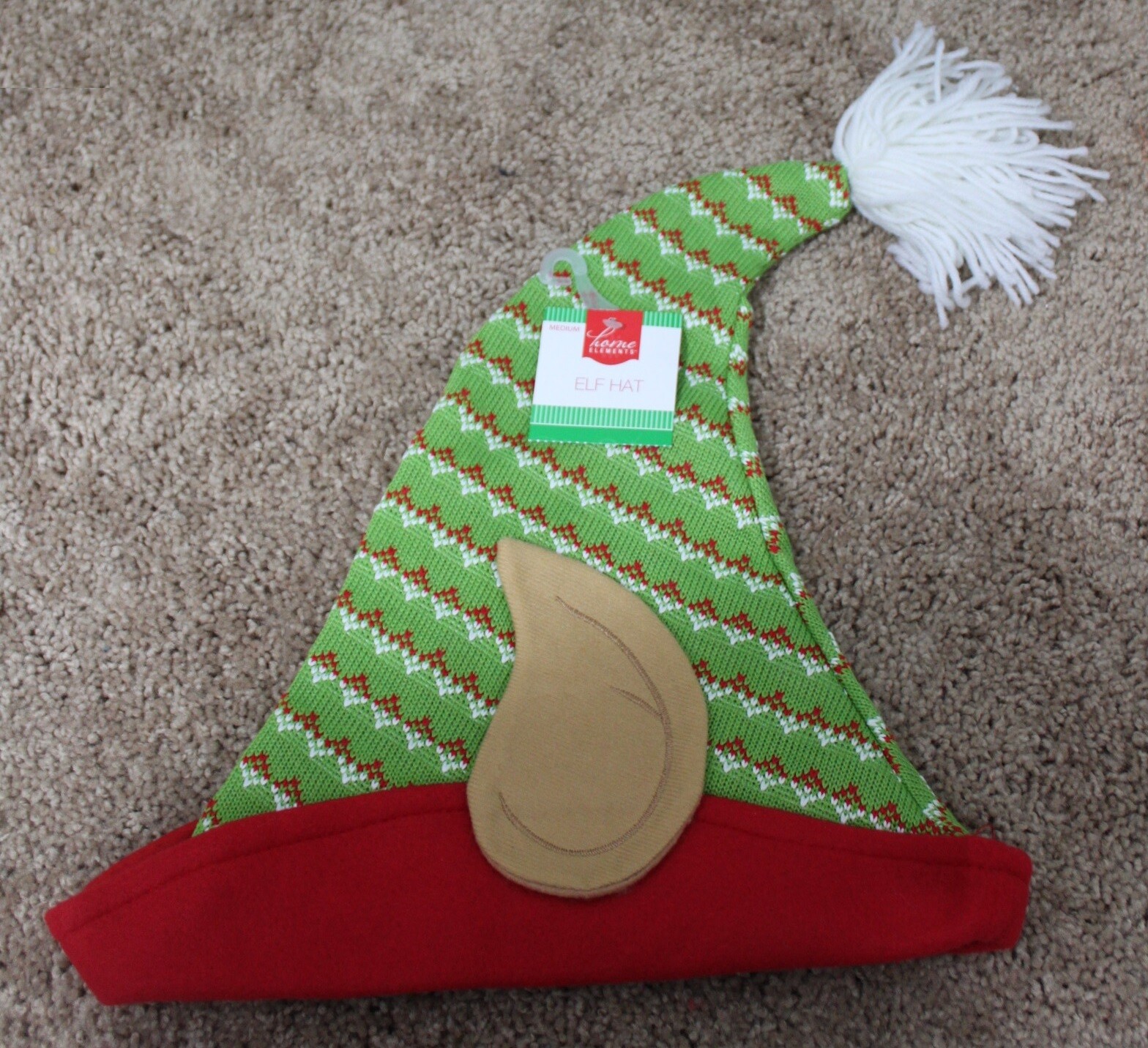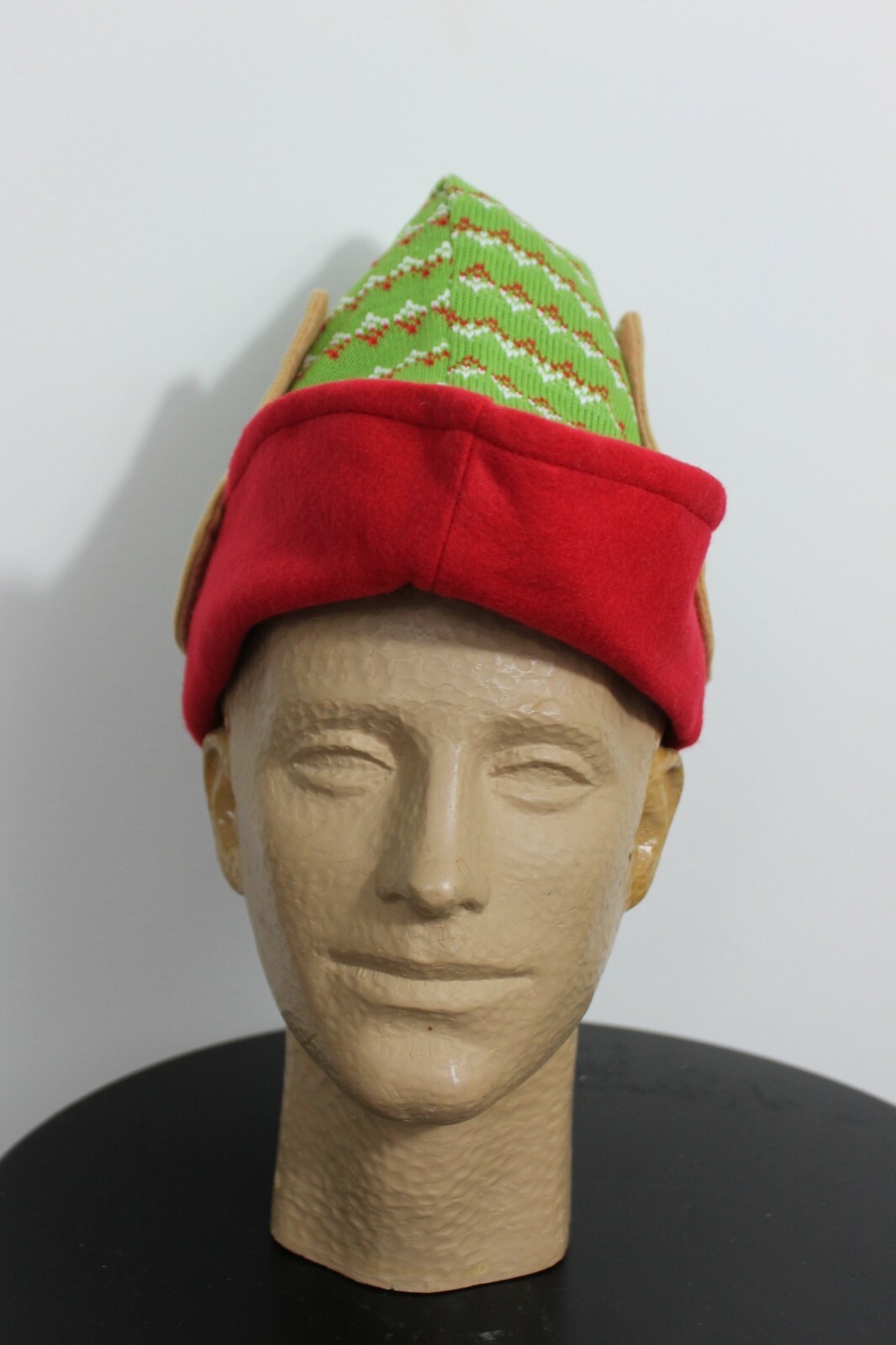 Green knit elf hat with large elf ears. The top has a white yarn pom pom and there is a red brim.