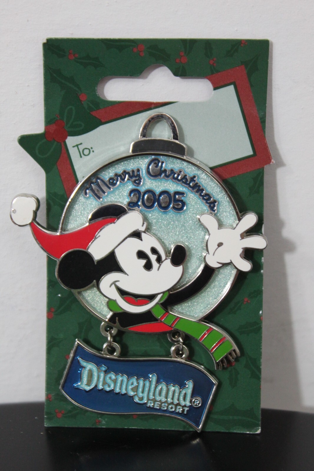 A festive holiday pin featuring Mickey Mouse and from the holiday ornament collection. This holiday ornament pin is shaped like a ornament. Mickey was part of a nine-pin collection was designed by Disney Design Group Artist Susan Foy. Mickey is a pin-on-pin. This pin also features a dangle with the Disneyland Resort logo.